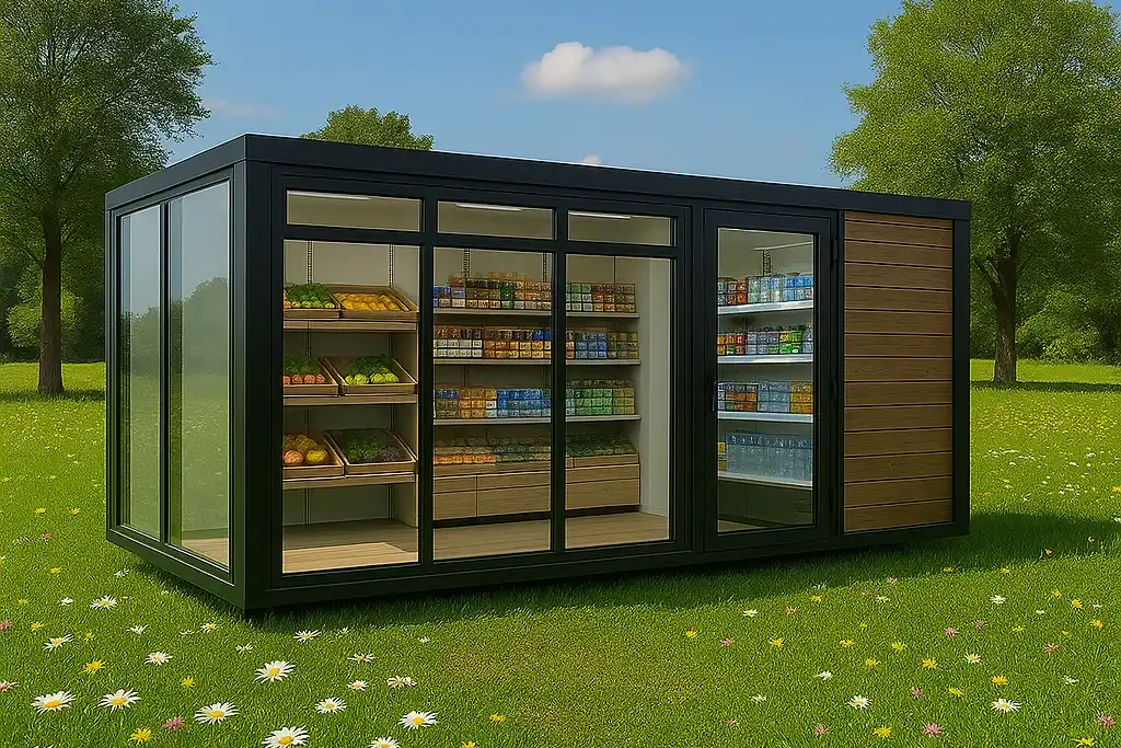Utilice nuestra minicasa estudio como tienda móvil. Este estudio modular compacto le permite crear una tienda de conveniencia o boutique móvil, ideal para festivales, mercados o zonas remotas.