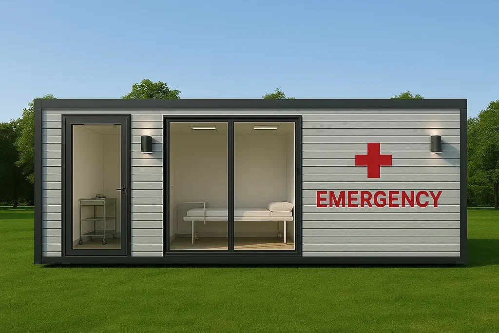 En emergencias médicas o en regiones remotas, una casa estudio prefabricada se convierte en una unidad de atención de emergencias de despliegue rápido. Esta casa estudio prefabricada puede instalarse rápidamente para servir como puesto de primeros auxilios o clínica móvil.
